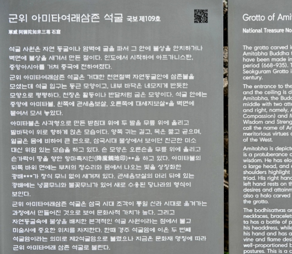 삼국시대인 신라 소지왕 때(493년) 극달화상에 의해 창건되었다고 전해지는 태고종 소속의 사찰로 정식명칭은 군위 삼존 석굴사이지만 제2 석굴암 또는 군위 삼존석불 또는 팔공산 석굴암으로 더 알려진 군위 삼존 석굴사는 경주 석굴암보다 100년 전에 만들어져 석굴암 조성에 영향을 주었다고 한다. 팔공산은 자주(?) 오지만 갓바위 부처님께만 인사드리고 돌아가기 바빴는데 오늘은 팔공산의 또 다른 자랑인 아미타여래 삼존 석굴을 소개할 수 있어 나 또한 설레인다.^^