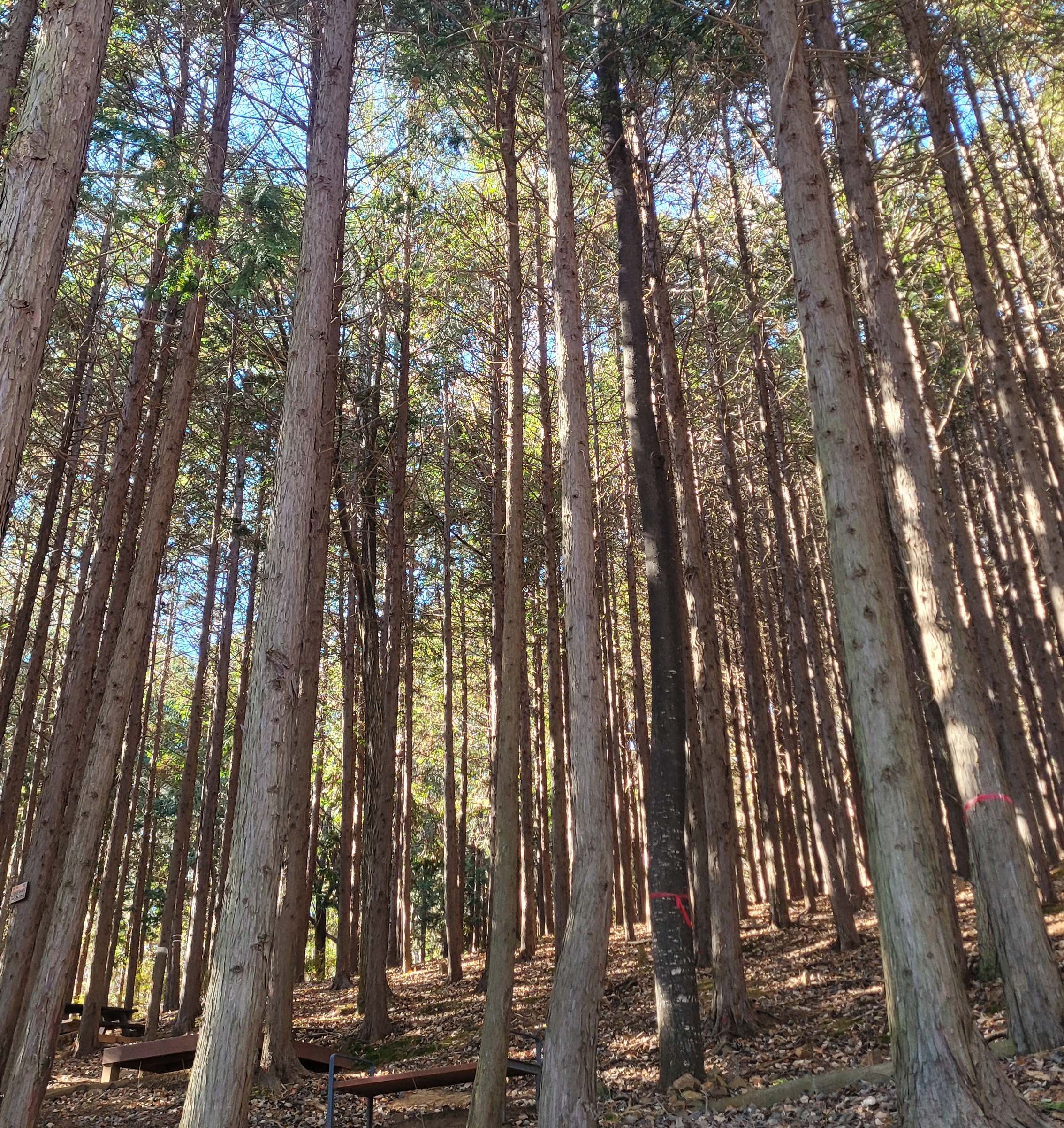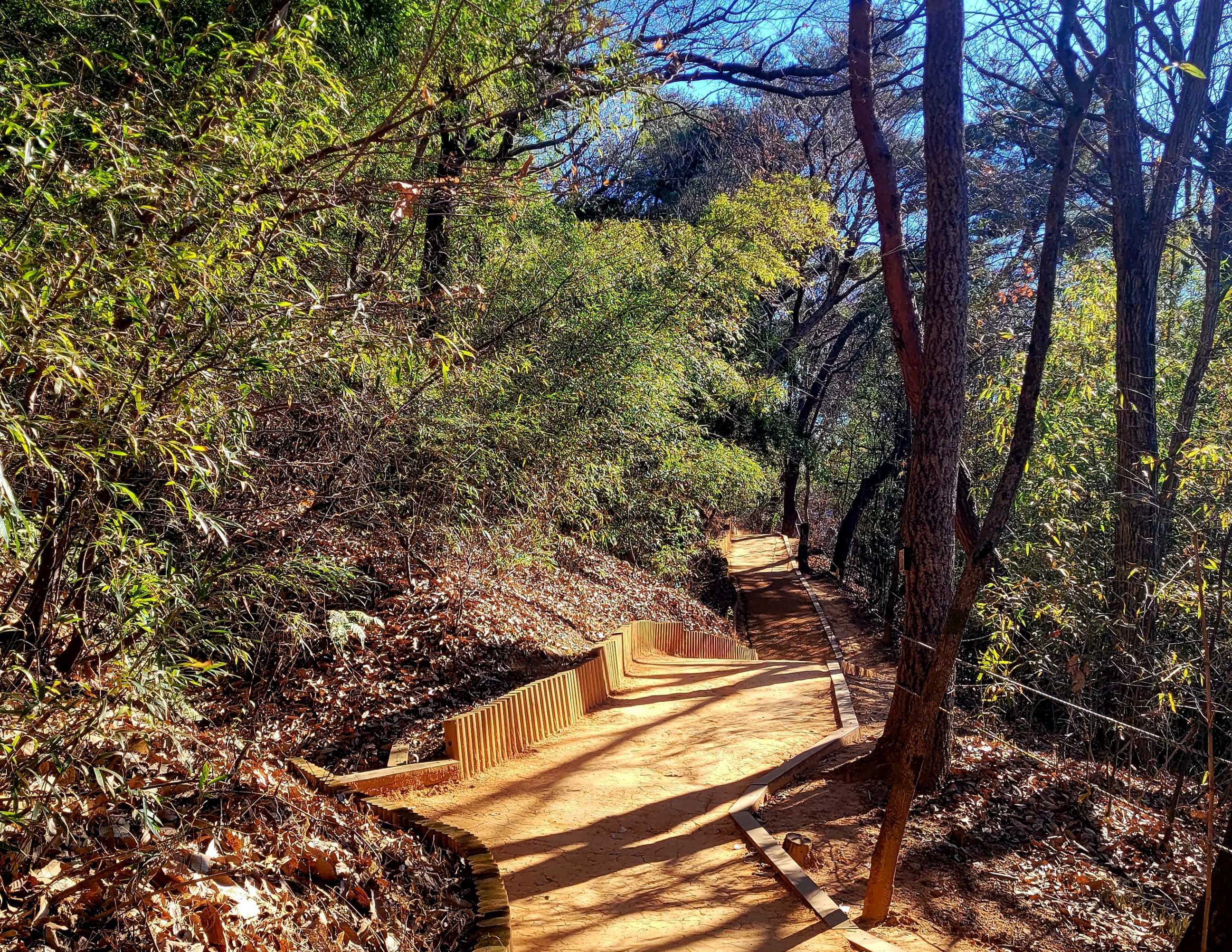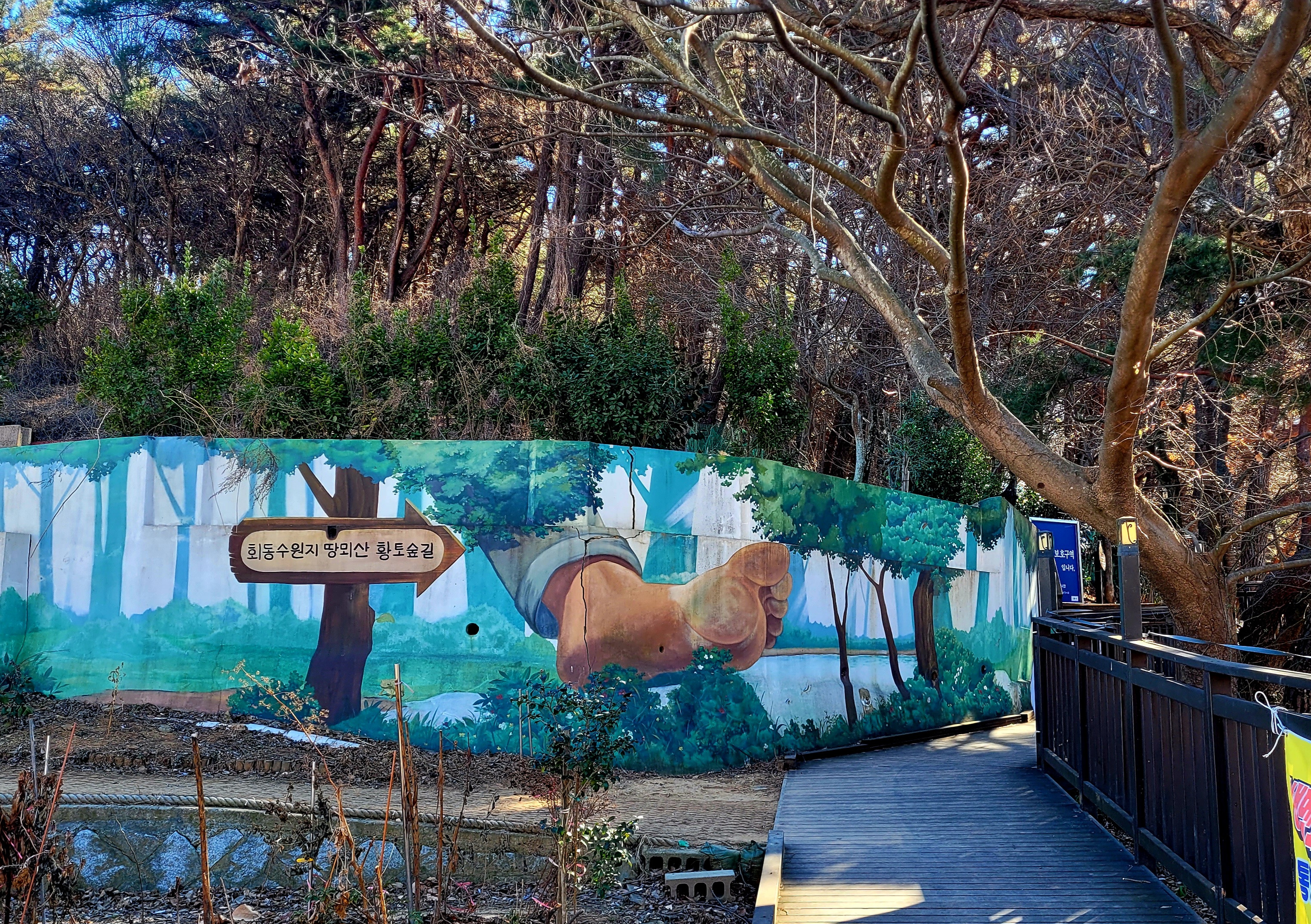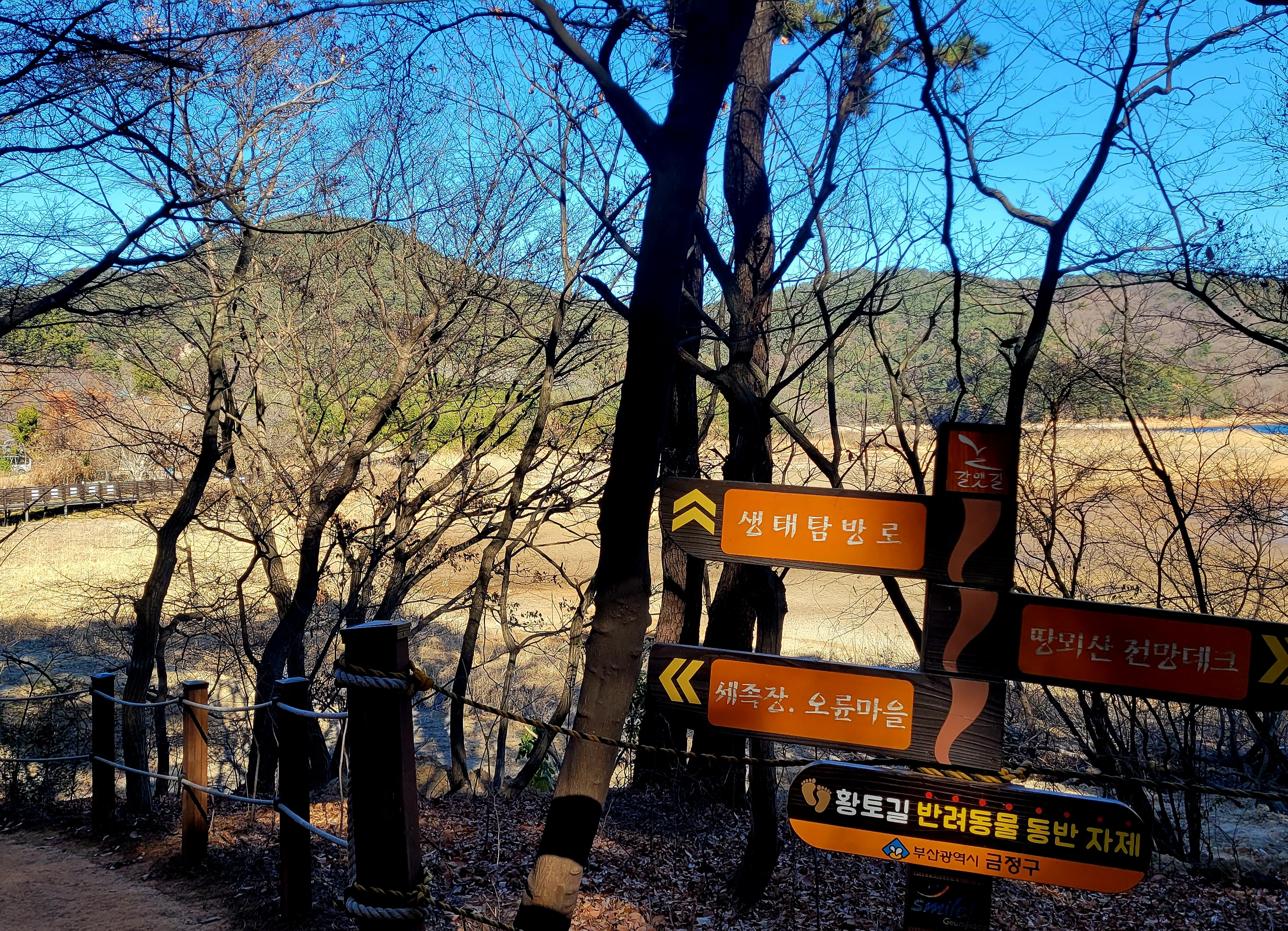 땅뫼산 황토숲길은 1.7km 정도이며 한 바퀴 도는데 30분 정도면 충분하다. 곳곳에 쉴 수 있는 자리와 평상이 있어 다들 한 곳에 짐과 신발을 놓아두고 한 바퀴 돌고 와서 쉬며 차 한잔하다가 다시 돌며 휴식을 취하는 곳이다. 힘들이지 않아도 되는 곳이라 어른들이 많은 편이다. 우리도 한 곳에 짐을 두고 다시 돌기로 한다. 겨울이라 신발은 벗지 않기로 ~~